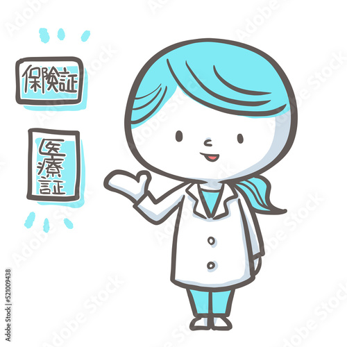 © ichigoichie, Obraz premium 保険証と医療証について提示を案内する薬剤師 青バージョン