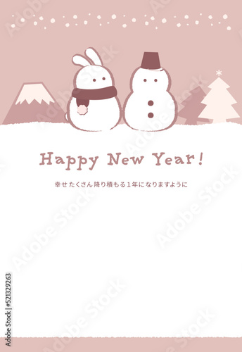 © Kimama, Fototapeta premium 雪だるまとうさぎが並んだ卯年年賀状デザイン 茶色背景