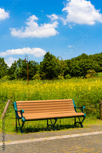 © planas, Obraz premium 公園に置かれた茶色のベンチ