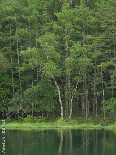 Obraz premium 新緑の湖畔の風景 長野県御射鹿池 7月