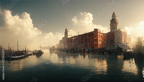 © GINGER_Tsukahara, Fototapeta premium イラスト 絵画 水上都市 街 水路 運河