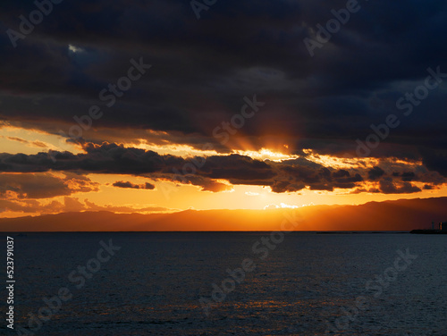 © yummy_you2, Obraz premium 日本、神奈川県、鎌倉市、雲の隙間から見える七里ガ浜の夕陽