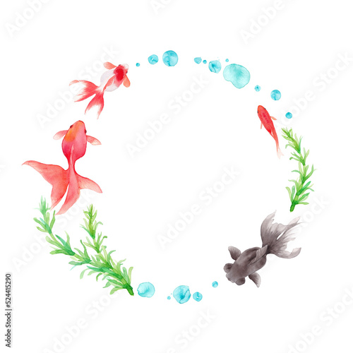 Naklejka premium 金魚と水草の水彩イラストで装飾した円形フレーム(透過背景)