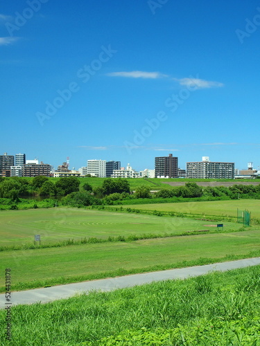 © smtd3, Obraz premium 江戸川土手から見る誰もいない猛暑日の野球場のある江戸川河川敷風景