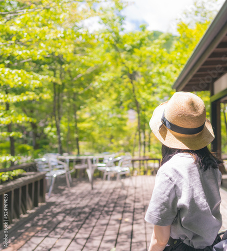 © SHO photograph, Obraz premium 麦わら帽子 女性 ワンピース 夏 テラス