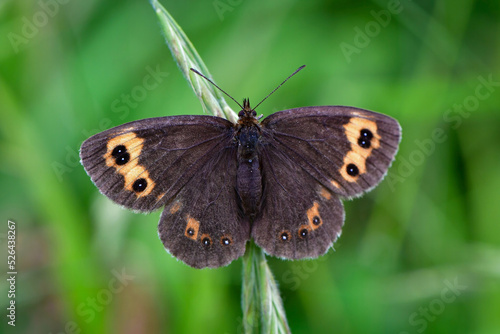 Obraz premium 晩夏の湯ノ丸高原でマツムシソウやマルバダケブキに訪れる高山蝶のベニヒカゲ