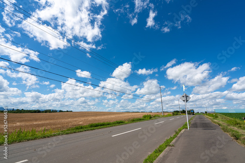 © jyapa, Fototapeta premium 北海道、富良野の一本道と農地