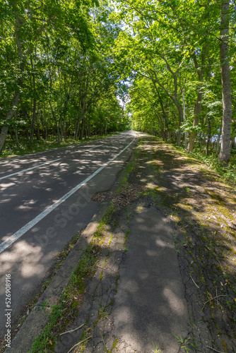 © Masa Tsuchiya, Obraz premium 木漏れ日の中を通るアスファルトの道。