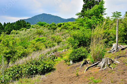 Obraz premium 西丹沢の湯船山稜コース 新緑のサンショウバラノ丘より白クラノ頭を望む