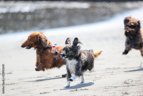 © D maborosi, Naklejka premium 海で遊ぶチワックスの犬とダックスフント