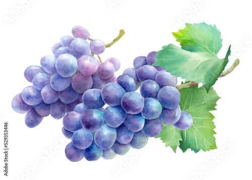 © Keiko Takamatsu, Fototapeta premium 2つの葉付きの紫葡萄。水彩イラスト。巨峰。(透過背景)