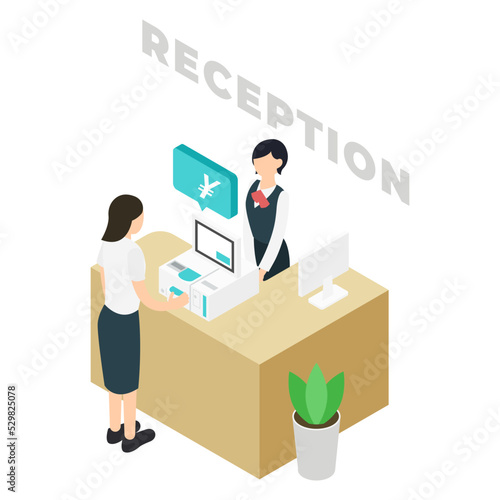 © たかはし まりな, Fototapeta premium 受付カウンターとセルフレジを使う女性