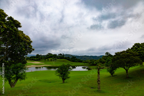 Naklejka premium 南国風リゾートの美しいゴルフ場・ゴルフコースで怪しい空模様と雷雲(千葉県富津市)
