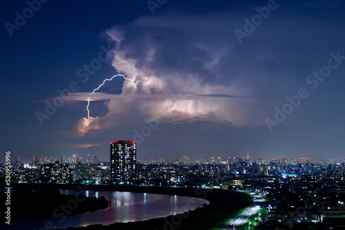 © Saitan, Fototapeta premium 不気味に光る巨大な積乱雲から稲妻が落ちる