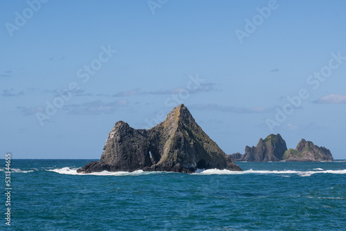 Naklejka premium 西積丹 積丹ブルーの窓岩、西の河原の岩々