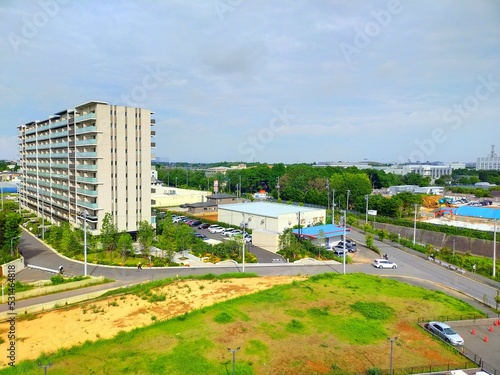 Obraz premium 柏市のホテルの窓から見た夏の朝の風景(コピースペースあり)