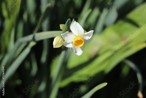 © 俊朗 浅川, Fototapeta premium 日本の冬の庭に咲く白い花びらと黄色い副花冠を持つフサザキスイセンの花