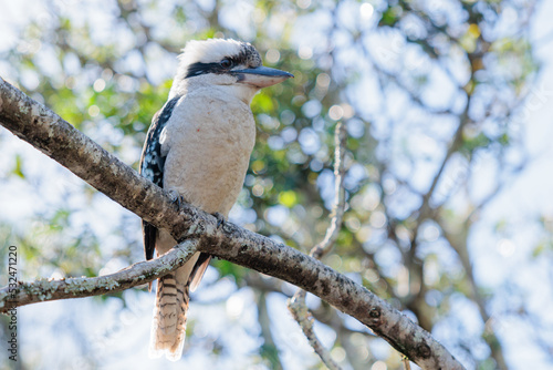 Fototapeta premium 温かい日差しの中で木にとまるワライカワセミ