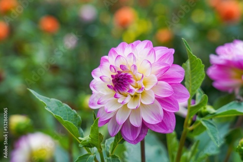 © Scott Mirror, Obraz premium 光を浴びて輝く満開の赤紫のグラデーションのダリア