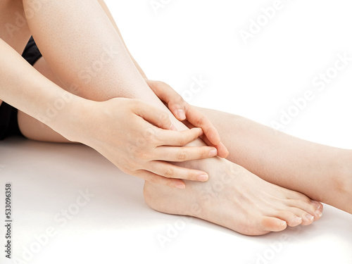 © mapo, Obraz premium 白背景で痛い足の関節を押さえる女性