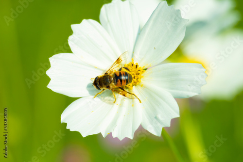 Fototapeta premium 白いコスモスに留ったミツバチ