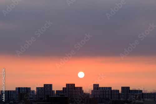 © Takamori Miyagishi , Fototapeta premium 兵庫県神戸市東灘区の高層マンションの上層階からの夜明け。大阪生駒山から太陽が昇り、あたりはオレンジ色に染まり、ビル群がシルエットで浮かぶ