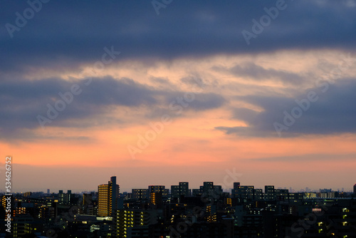 © 宮岸孝守, Fototapeta premium 都市の夜明け。明け方、神戸市街地から芦屋方面の景観。神戸市東灘区のマンション高層階より撮影