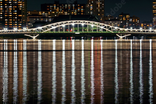 Obraz premium 水面の反射光が美しいライトアップされた白髭橋