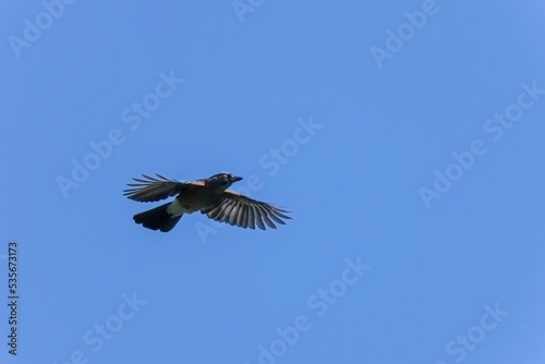 Fototapeta premium 青空バックに元気に飛び回るカケス