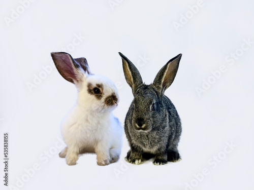 © chikala, Fototapeta premium 白背景前に座る白ウサギと黒ウサギの正面からの全身