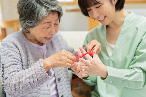 Fototapeta premium 孫とあやとりをするシニア女性