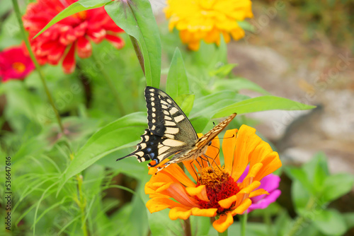 Obraz premium 日本の秋、ジニアの蜜を吸うアゲハ蝶