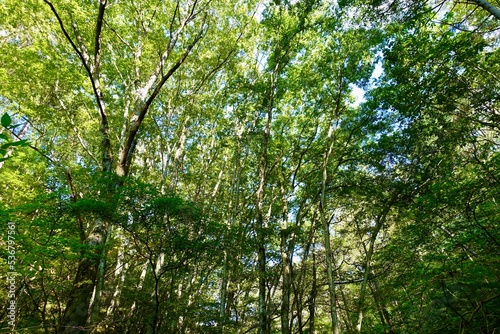 Fototapeta premium 木漏れ日溢れる森 緑の背景