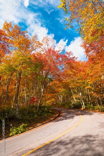 © Akio Mic, Obraz premium 【鳥取県】赤く紅葉した11月上旬の秋の大山の車道 ドライブ