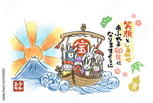 © ウサトコ, Fototapeta premium 宝船に乗ったうさぎの七福神 絵手紙風年賀状