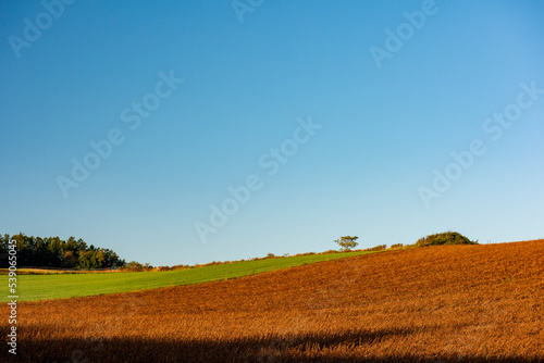 Obraz premium 朝日に照らされた畝と消えゆく月