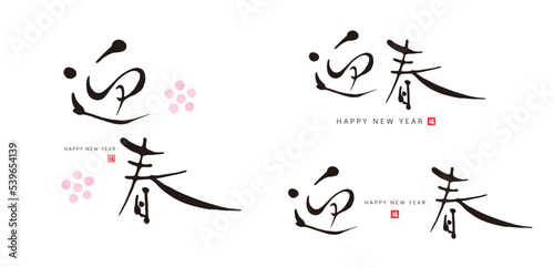 Naklejka premium 迎春 筆文字 赤い小さなはんこ;福