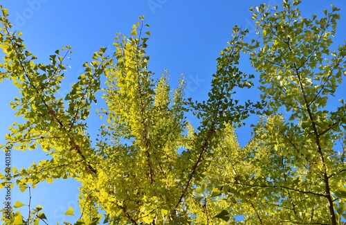 © ペパーミント, Fototapeta premium 青空に輝くイチョウの葉 秋の風景 栃木