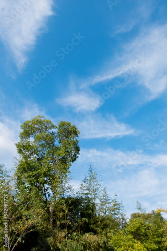 Obraz premium 秋の青空に緑の木々 公園の自然