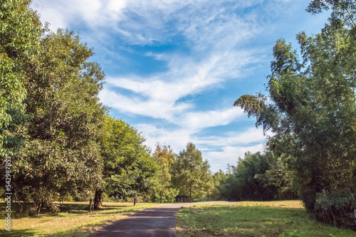 Obraz premium 秋の青空に緑の木々 公園の自然