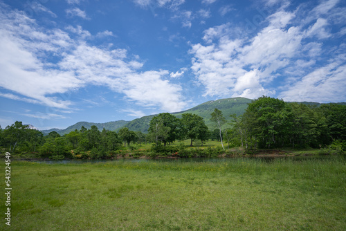 © hiroyoshi, Fototapeta premium 妙高の山に囲まれて笹ヶ峰高原の牧草地が広がる