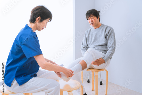 Obraz premium 医者に包帯を巻かれる中年男性 医療イメージ