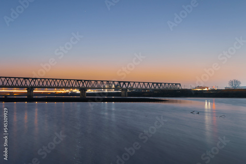 Fototapeta premium 朝方の河川敷と鉄橋
