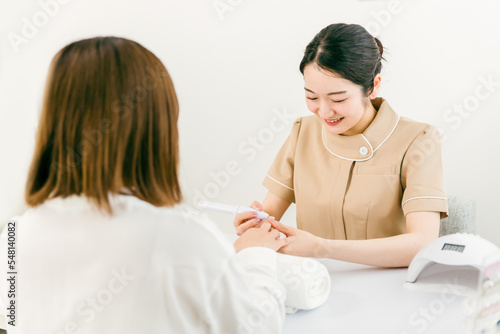 Obraz premium ネイルサロンで下準備のプリパレーションをするネイリストとアジア人女性