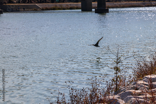 Fototapeta premium 水面近くを飛ぶ黒い鳥
