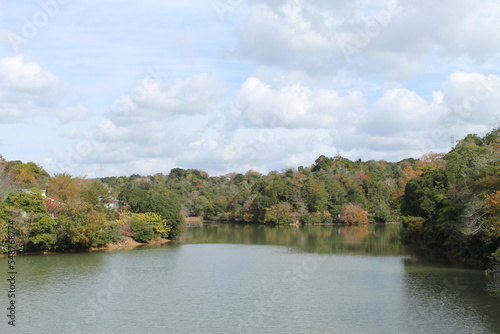 © Yu Wan, Obraz premium 空と湖と秋の森(日本)