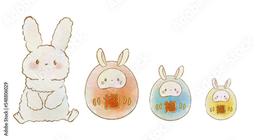 Fototapeta premium イラスト素材:うさぎと3つのうさぎの達磨(手描き水彩風)
