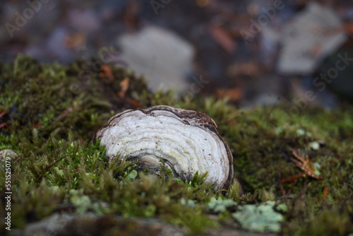 Obraz premium 倒れた木に生えた黄緑の苔と白いキノコ