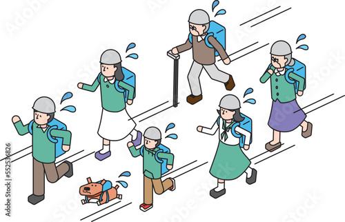 © ribitts, Naklejka premium 避難する三世帯の家族とペットの犬のアイソメイラスト