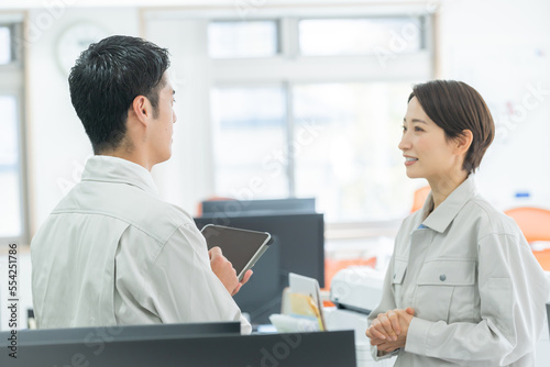 Obraz premium タブレットを見ながら話しをする日本人男女